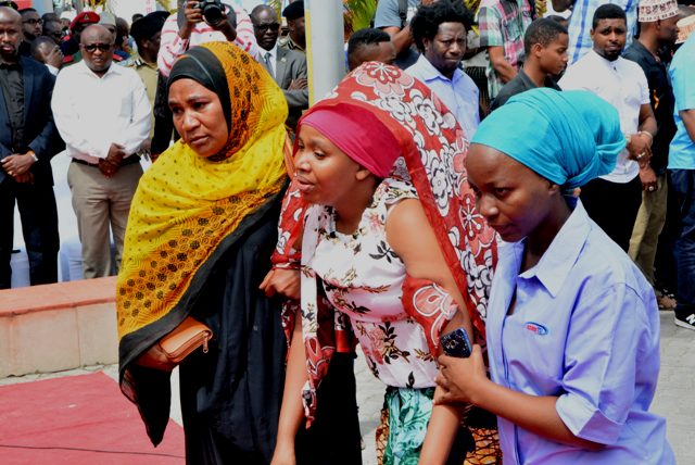 Waombolezajimbalimbali wakisimama wakati miili ya wafanyakazi hao ikiwasili.