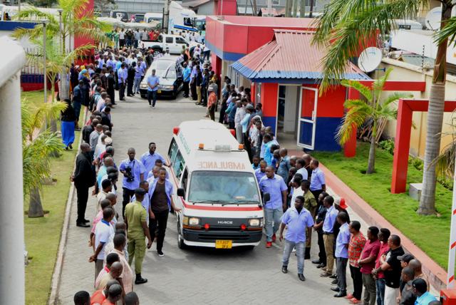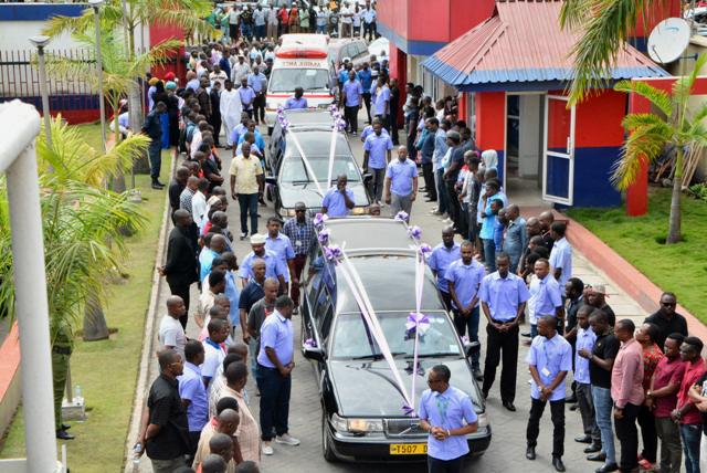Magari maalum yaliyobe miili ya waliokuwa wafanyakazi wa Azam Media yakiwasili kwenye ofisi za Azamn Media kwa ajili ya kuagwa rasmi kwa miili hiyo ili kuendelea na taratibu za mazishi katika maeneo mbalimbali marehemu hao watakakozikwa.