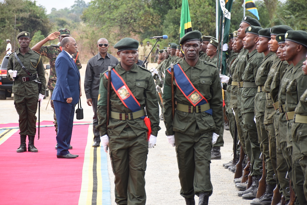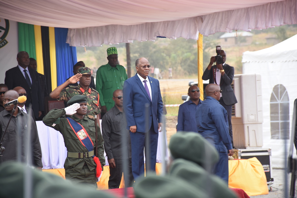 Rais wa Jamhuri ya Muungano wa Tanzania Dkt. John Pombe Magufuli akikagua gwaride la Jeshi Usu wakati wa Uzinduzi wa Hifadhi ya Taifa ya Burigi-Chato leo Mkoani Geita.