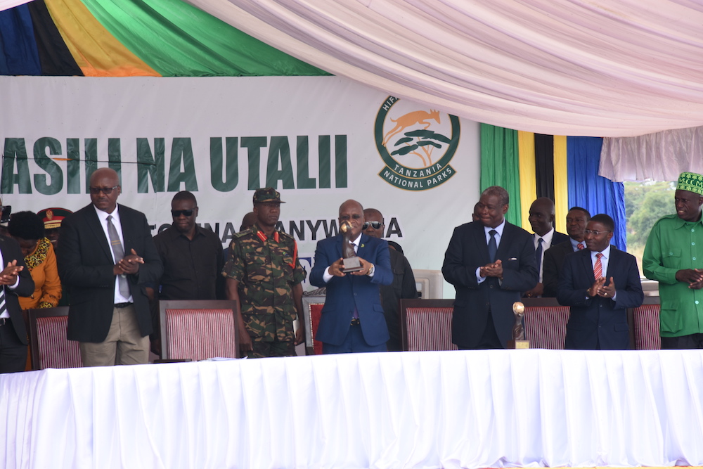 -Rais wa Jamhuri ya Muungano wa Tanzania Dkt. John Pombe Magufuli akionyesha Tuzo ya Serengeti Kuwa Hifadhi Bora Afrika baada ya Kukabidhiwa na Waziri wa Maliasili na Utalii Mhe. Dkt. Hamisi Kigwangalla wakati wa Uzinduzi wa Hifadhi ya Taifa ya Burigi-Chato leo Mkoani Geita.