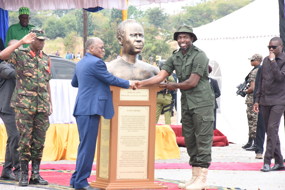 Waziri wa Maliasili na Utalii Mhe. Dkt. Hamisi Kigwangalla akimpa Zawadi Rais wa Jamhuri ya Muungano wa Tanzania Dkt. John Pombe Magufuli ya Sanamu ya Baba wa Taifa Hayati Mwalimu Julius Kambarage Nyerere wakati wa Uzinduzi wa Hifadhi ya Taifa ya Burigi-Chato leo Mkoani Geita.