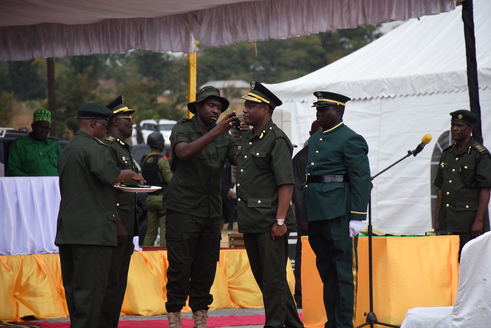 Waziri wa Maliasili na Utalii Mhe. Dkt. Hamisi Kigwangalla akiwavisha vyeo vya Kuwa Makamishna wakuu wa Taasisi nne za TAWA, TANAPA, TFS na Mamlaka ya Ngorongoro.