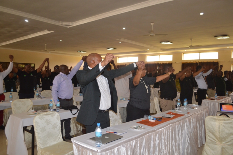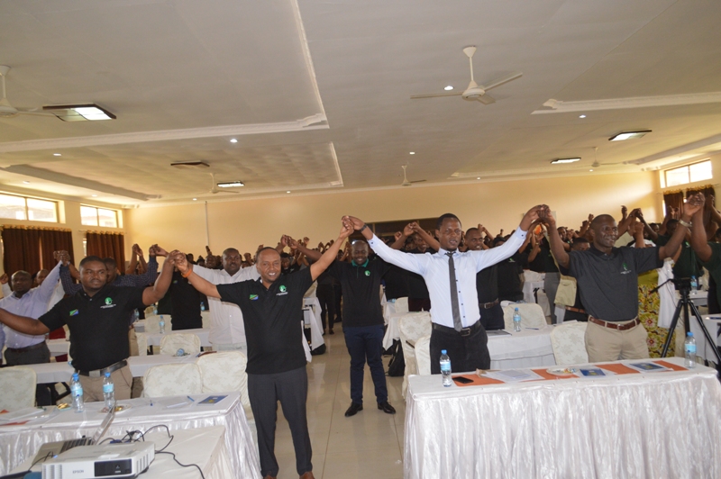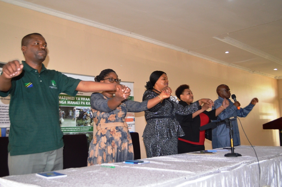 Sehemu ya wajumbe na waalikwa wa Mkutano wa Baraza la Wafanyakazi la OSHA wakiimba wimbo wa Umoja na Mshikamano wakati wa Mkutano huo.