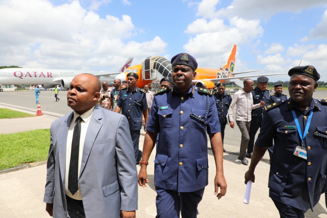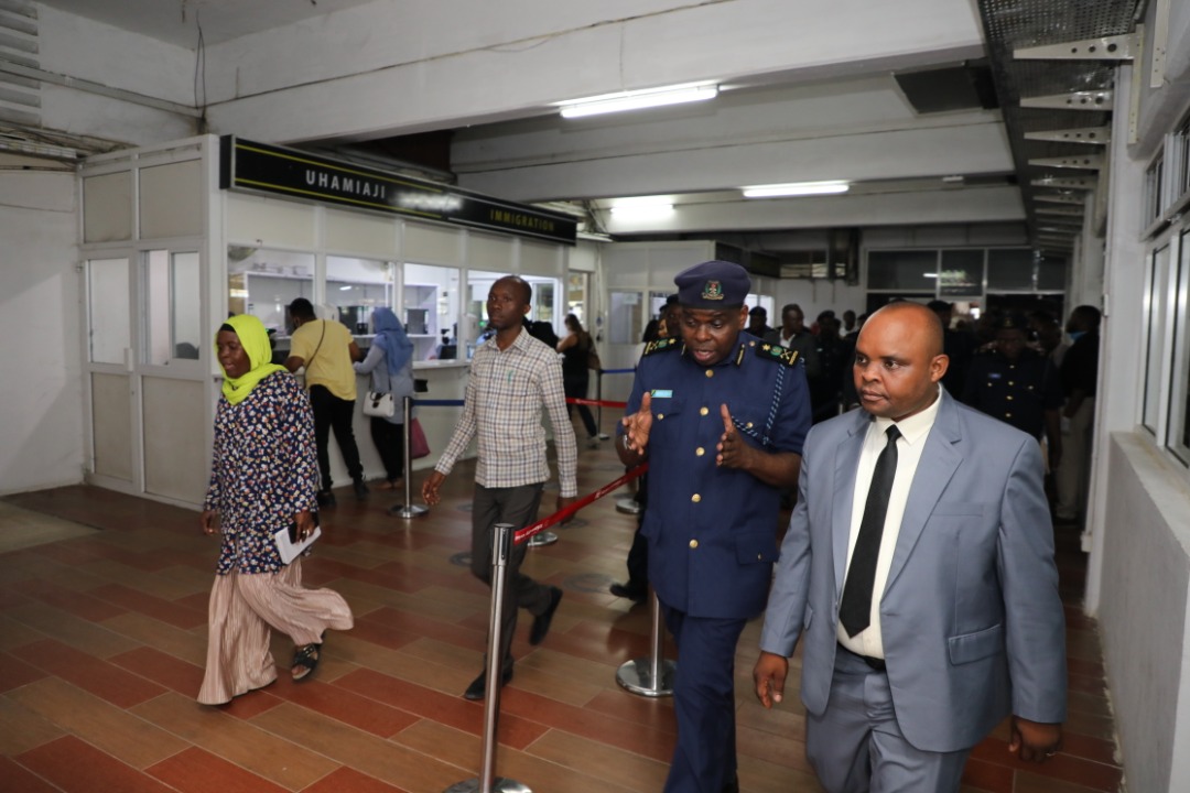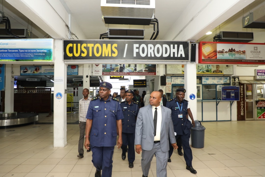 Naibu Waziri wa Mambo ya Ndani ya Nchi, Khamis Hamza Chilo, akiongozana na Kamishna wa Uhamiaji Zanzibar, Johari Sururu (katikati), wakati wa ziara ya ukaguzi wa huduma za Kiuhamiaji katika Uwanja wa Ndege wa Kimataifa wa Abeid Amani Karume,Visiwani Zanzibar. Picha na Wizara ya Mambo ya Ndani ya Nchi