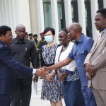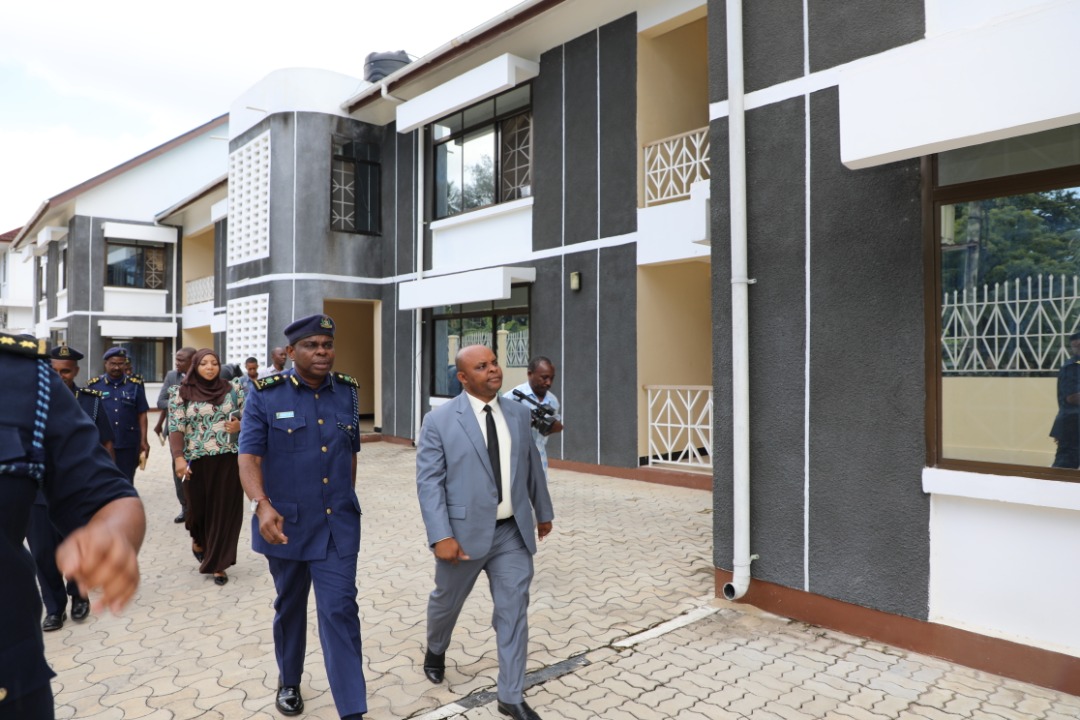 Naibu Waziri wa Mambo ya Ndani ya Nchi, Khamis Hamza Chilo, akiongozana na Kamishna wa Uhamiaji Zanzibar, Johari Sururu (kushoto), wakati wa ziara ya ukaguzi wa mradi wa ukarabati wa nyumba za askari polisi wa uhamiaji(zinazoonekana pichani), zilizopo Kiembe Samaki,Visiwani Zanzibar. Picha na Wizara ya Mambo ya Ndani ya Nchi