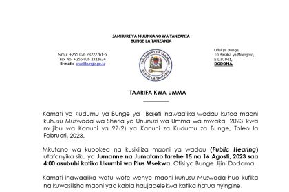WITO KWA WADAU KUTOA MAONI MUSWADA WA SHERIA UNUNUZI KWA UMMA WA MWAKA 2023